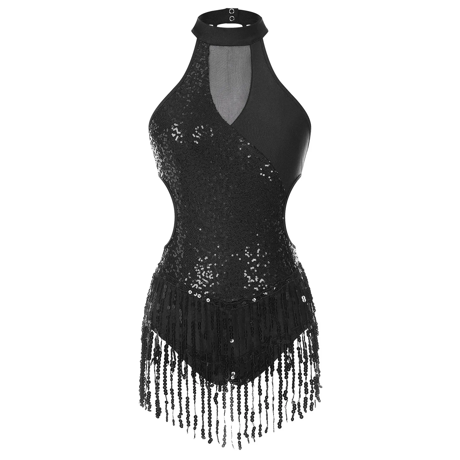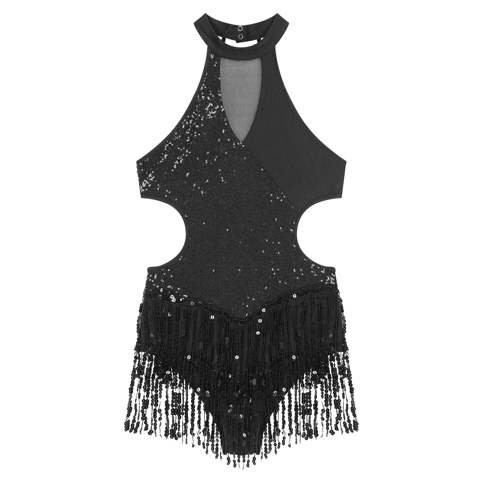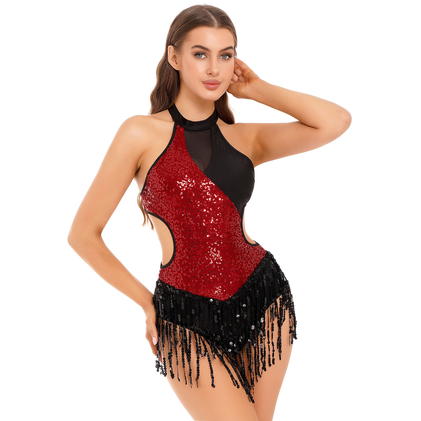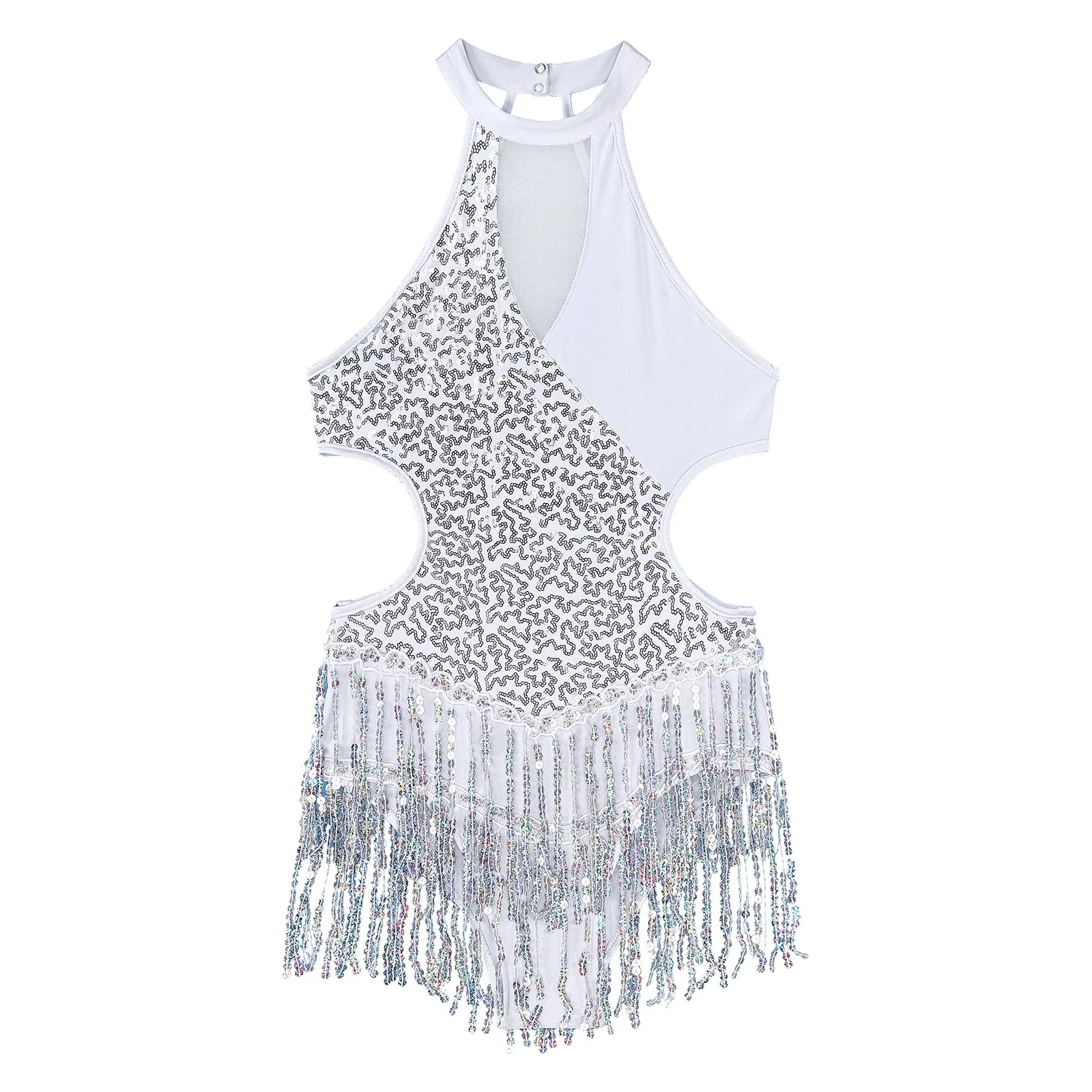 Women's Sleeveless Sequin Tassel Bodysuit Ballet Dance Performance Costume