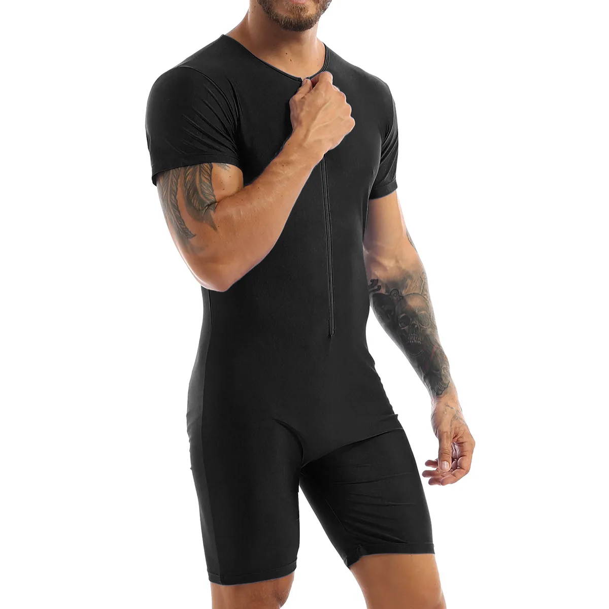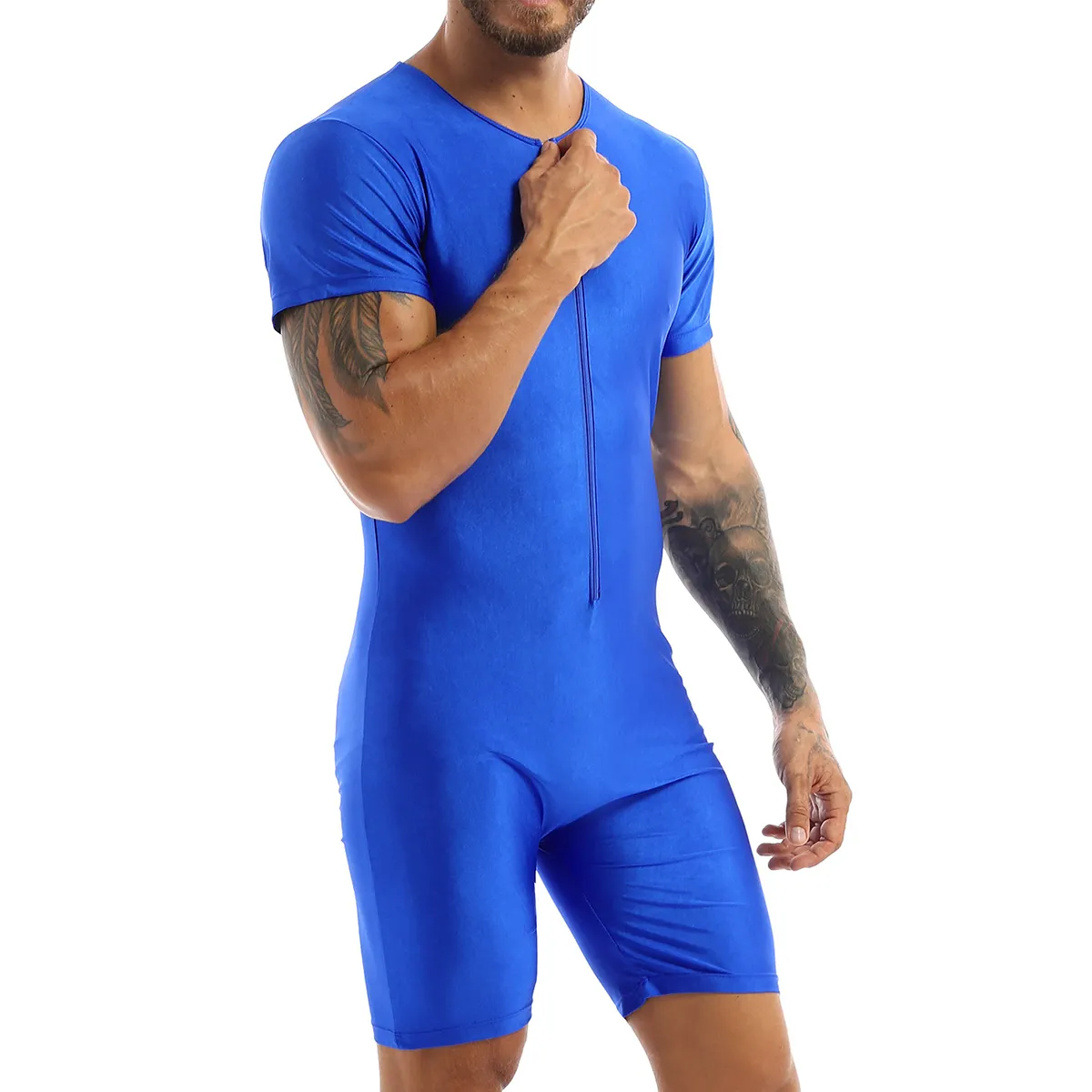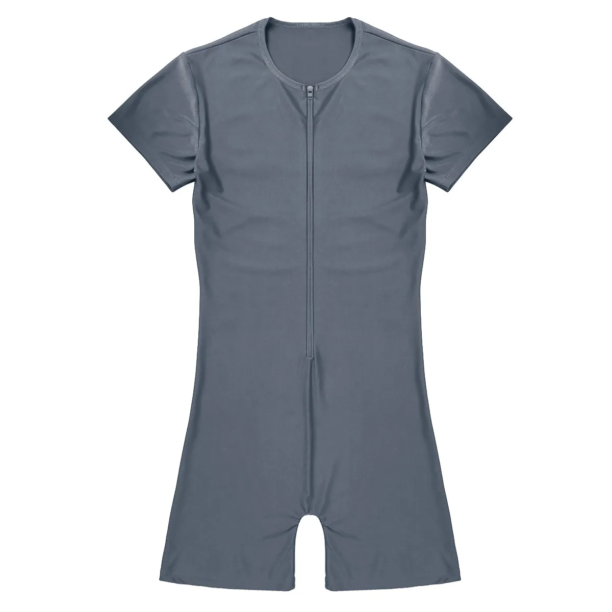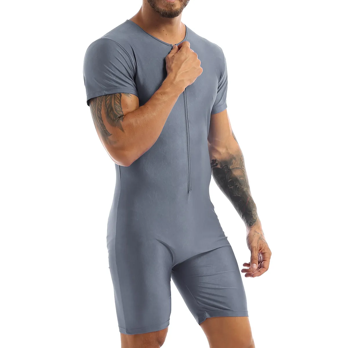 Men's Soft Swimwear Bodysuit, Short Sleeve Zipper Boxer Jumpsuit, Rash Guard Wetsuit for Pool, Beach, and Surfing